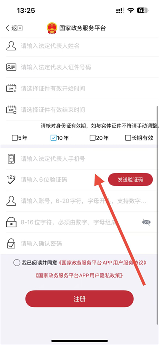 4、在注册界面依次填写法定代表人信息,勾选协议后点击注册,完成法人账号的注册操作。