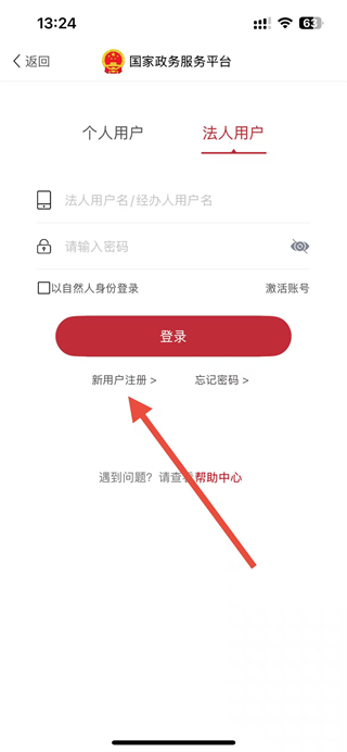 3、在法人用户页面里,找到新用户注册选项并点击,进入法人账号的注册信息填写界面。