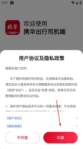 1、打开携华出行司机端,阅读用户协议及隐私政策内容,点击页面中的同意按钮。
