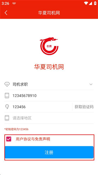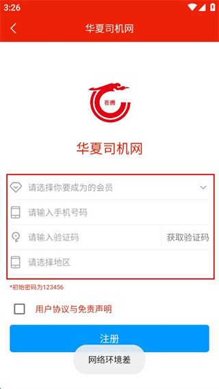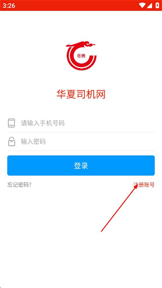 1、打开华夏司机网应用,在登录页面点击注册账号选项,进入注册页面。