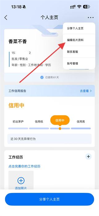 3、在个人主页页面右上角,点击三点图标展开菜单,选择编辑名片资料选项进入编辑页面。