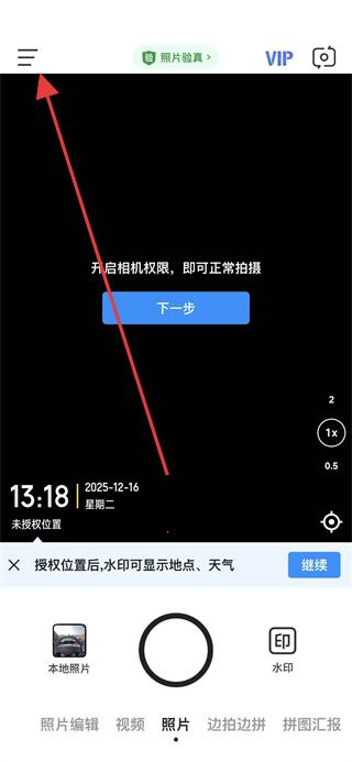 1、打开今日水印相机APP,点击左上角三条横线图标,弹出功能菜单。