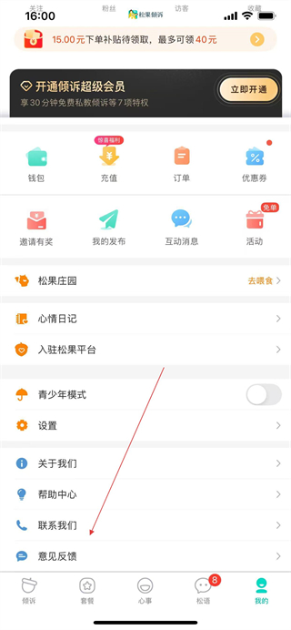 1、在松果倾诉的首页,点击底部我的选项,进入个人中心页面。