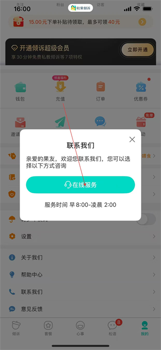 1、打开松果倾诉APP,进入我的页面,点击设置选项,进入设置界面。