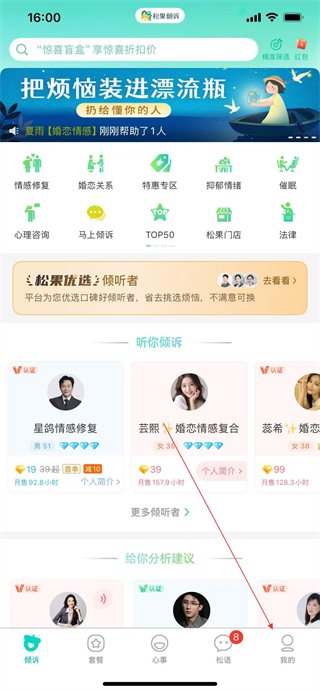 松果倾听者众多 1万多名倾听者---情感咨询师、婚姻家庭导师 、心理咨询师 、过来人、同性友人 、海归、人际关系达人、亲子教育达人、职业规划师、律师等,总有一个能帮你!