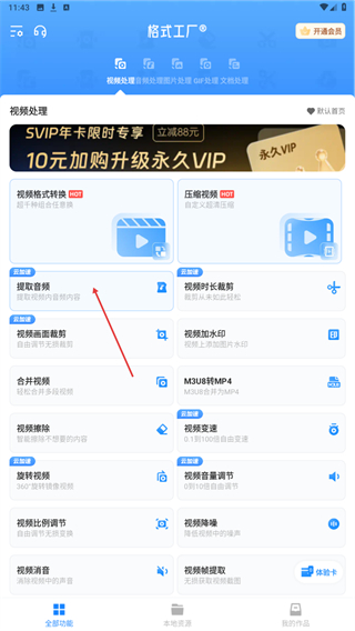 1、进入格式工厂的视频处理板块,找到并点击提取音频选项。