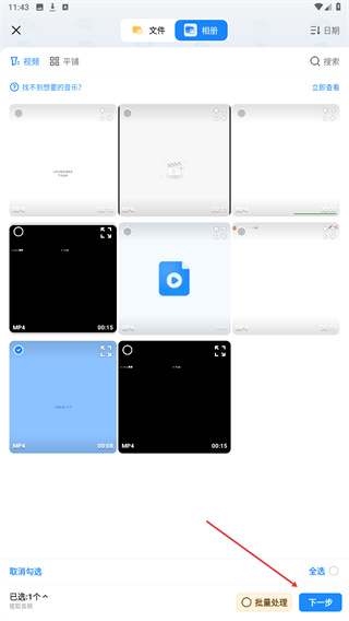 2、在弹出的相册界面中,勾选需要提取的音频,选好后点击下一步。