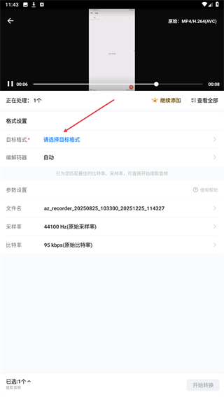 5、确认目标格式等参数后,点击页面右下角的开始转换按钮。