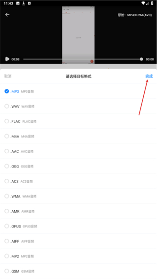 4、从列表中选定音频格式,如MP3,选好后点击完成的按钮。