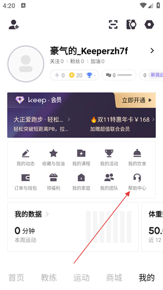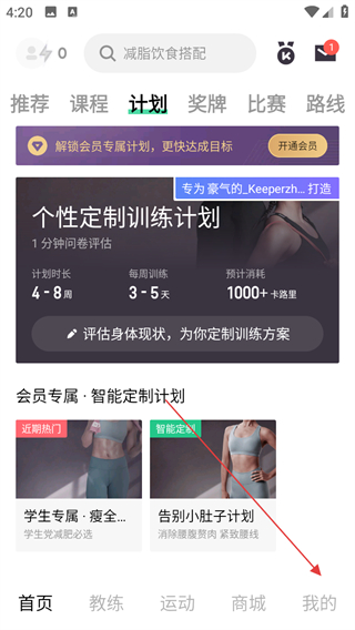 1、打开Keep首页,点击底部我的,进入个人页面。