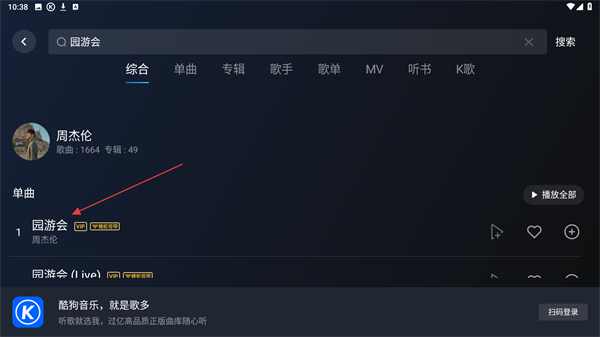 3、在结果的单曲分类下,找到目标歌曲条目,点击即可开始播放歌曲。
