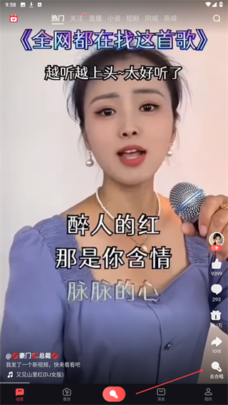 1、打开全民k歌APP,进入到首页内自动播放歌曲,点击右侧分享的图标。