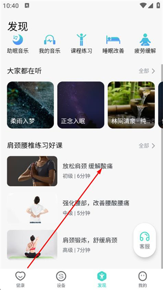 2、在发现页面的肩颈腰椎练习好课板块,选择目标训练课程。