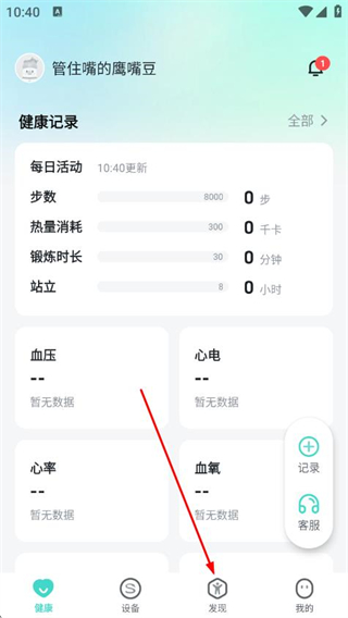 1、在SKG健康APP的健康界面,点击底部导航栏的发现,进入发现页面。