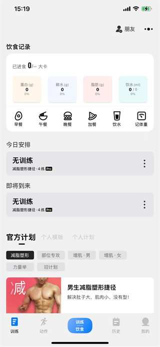 1、打开训记app,在饮食页面点击底部导航栏的历史选项,进入历史页面。