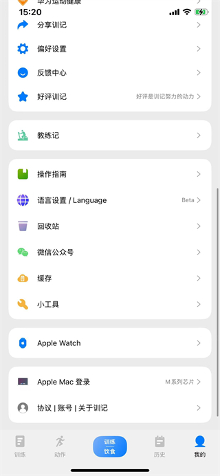 2、在个人页面中找到协议|账号|关于训记选项并点击,进入APP相关页面。