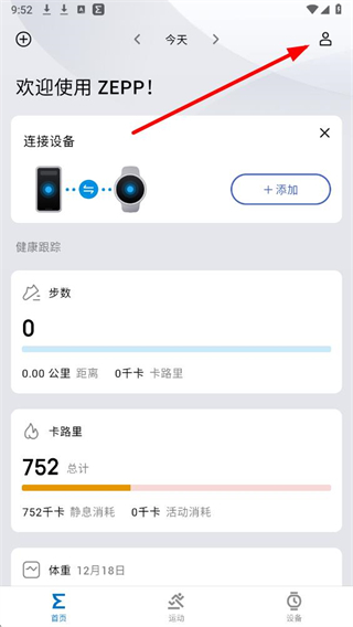 1、打开Zepp应用,点击首页右上角的个人中心图标。