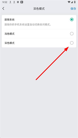 4、在深色模式页面,选中深色模式选项,点击右上角保存按钮完成设置。