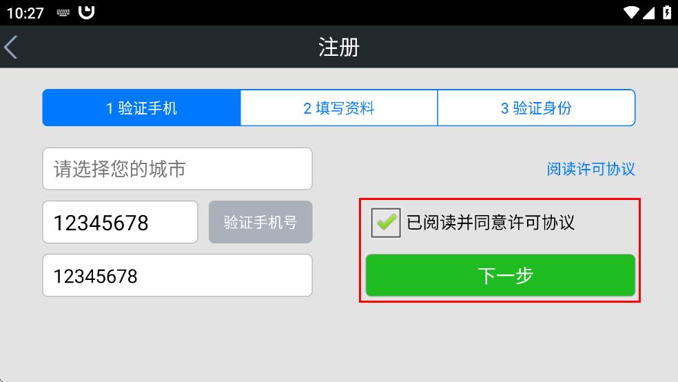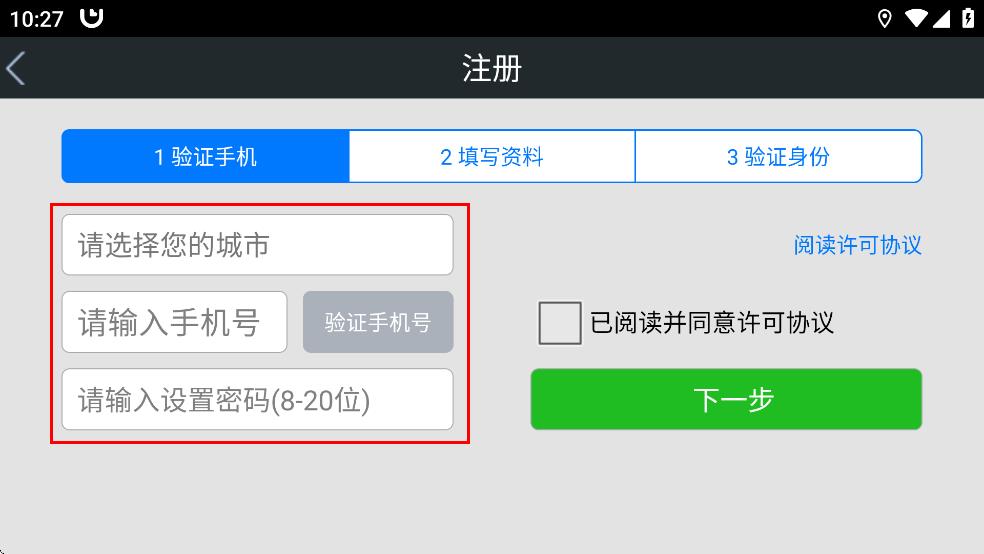 3、在验证手机页面选择对应城市,输入手机号并设置密码,找到许可协议勾选框。