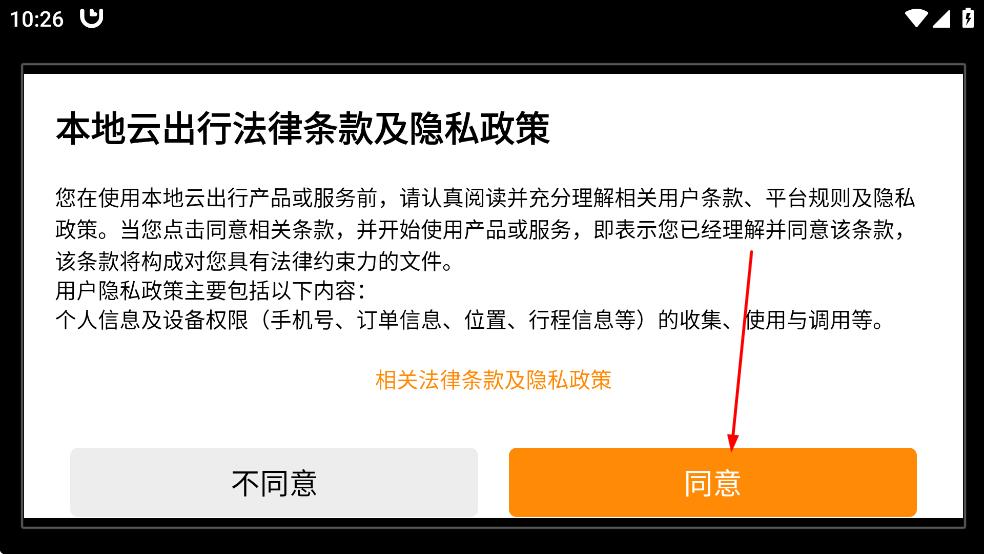 1、查看弹出的法律条款及隐私政策内容,点击界面中的同意按钮,进入欢迎页面。