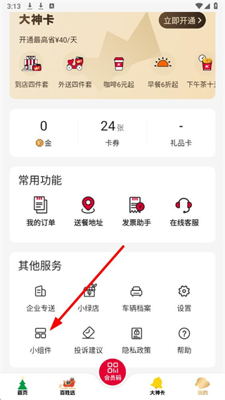 2、在我的页面的其他服务区域,找到并点击小组件选项,进入小组件皮肤页面。