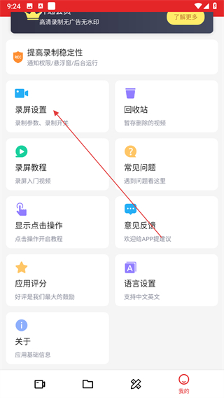 2、进入我的页面之后,在页面里找到录屏设置入口并点击。