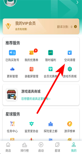 2、在个人中心的推荐服务板块里,找到空间清理选项并点击进入。