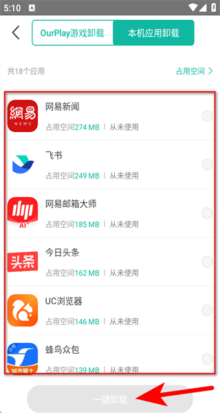 3、进入空间清理页面后,选择需要清理的应用,点击一键卸载完成清理。