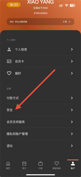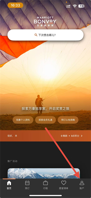 1、打开万豪旅享家APP,点击底部导航栏的账户选项,进入个人页面。