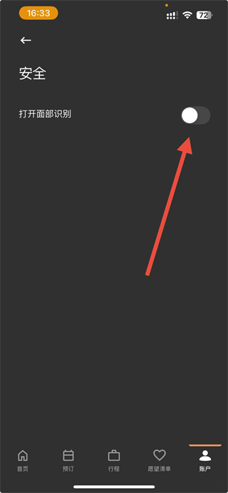 3、在安全界面中,找到打开面部识别选项,点击其右侧的开关按钮即可开启该功能。