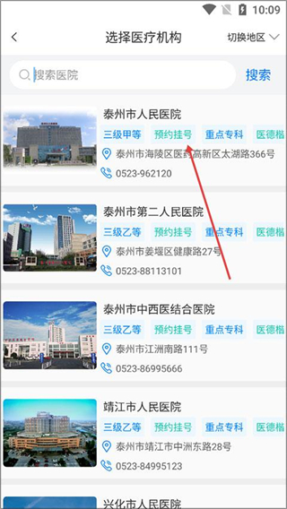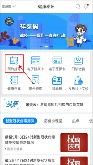 1、打开健康泰州APP,在首页点击预约挂号功能入口。