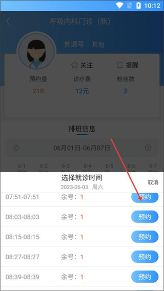 5、在挂号页面选择就诊日期,再选择对应医生及就诊时段,点击预约。