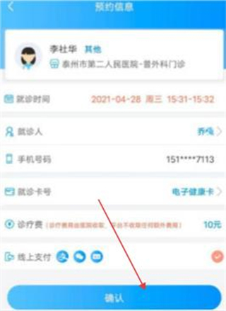6、在预约信息页面确认挂号信息无误后,点击确认完成预约。