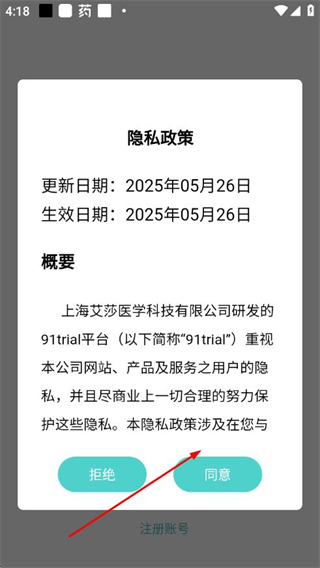 1、打开91Trial,在弹出的隐私政策页面点击同意,进入账号登录页面。