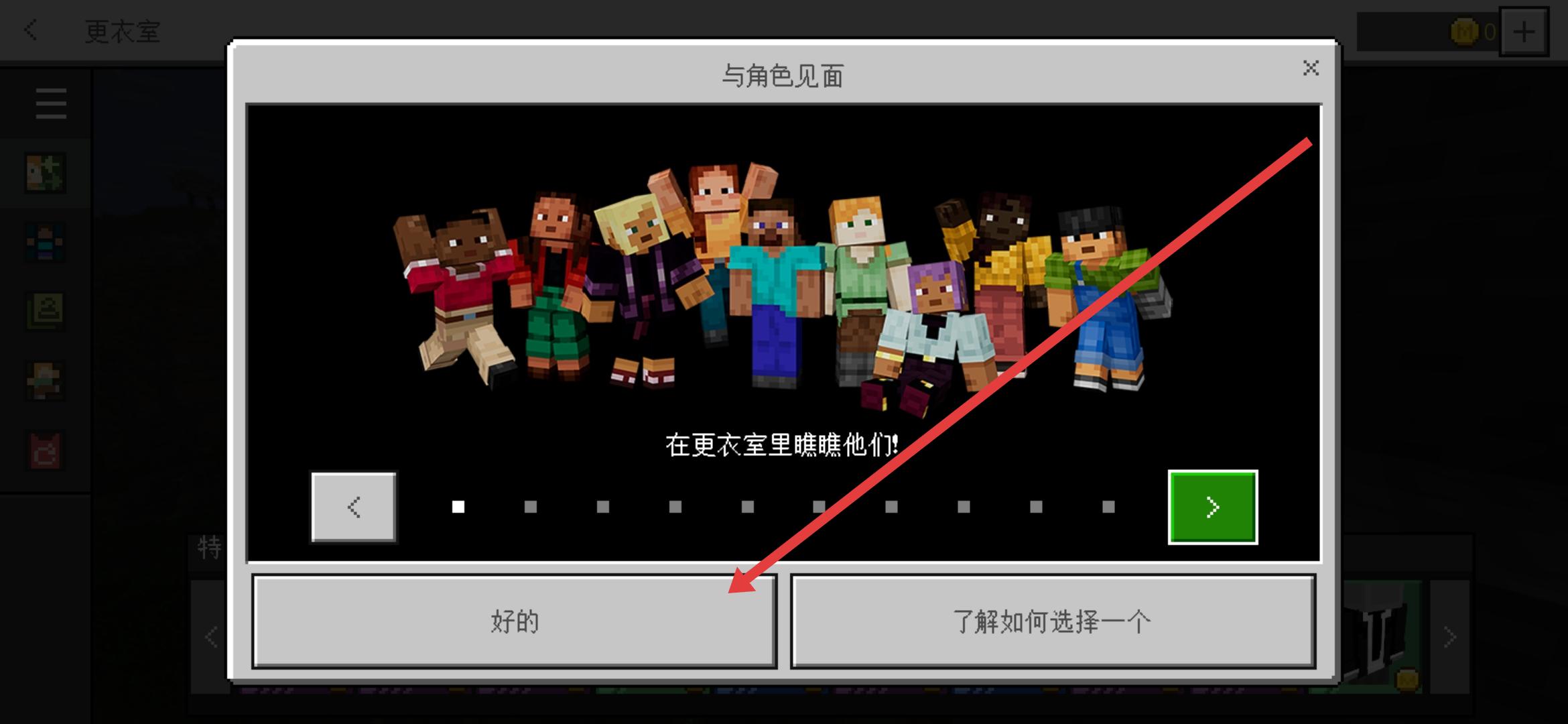 2、在弹出的与角色见面窗口中,点击好的,关闭引导提示并进入皮肤选择页面,为后续更换皮肤做准备。