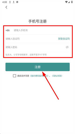 4、在手机号注册页面,填写手机号、验证码、密码,勾选协议后点击注册完成账号注册。
