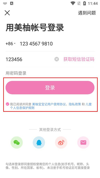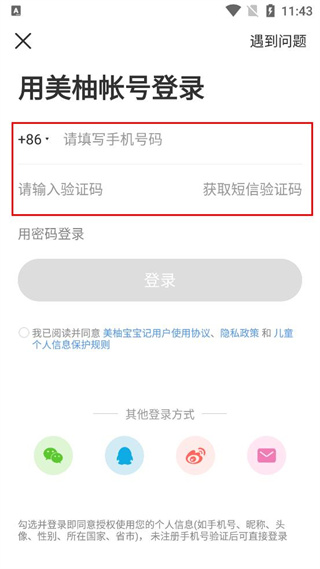 2、进入应用后,在登录选择界面找到美柚帐号登录按钮,点击该按钮进入登录页面。