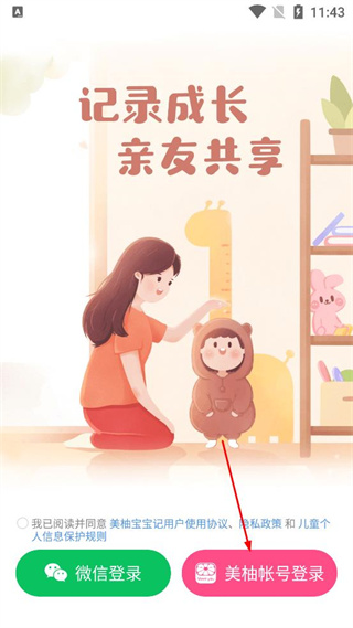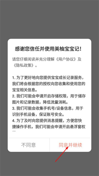 1、打开美柚宝宝记APP,查看弹出的用户协议及隐私政策提示,点击同意并继续按钮进入应用。