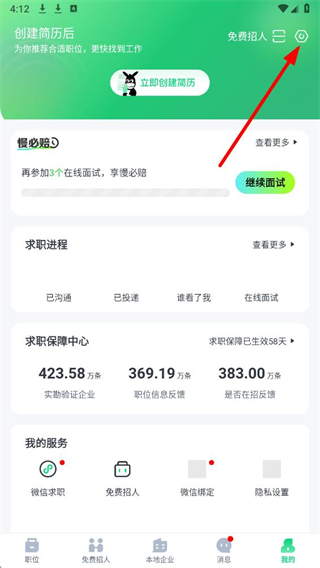 1、打开赶集招聘app,在个人页面右上角,点击设置图标,进入设置页面。