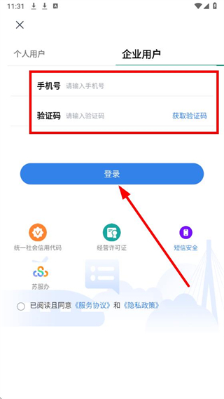 3、在界面填写企业绑定的手机号,获取验证码,勾选同意协议,点击登录按钮,即可使用短信登录。