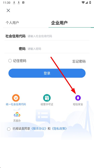 2、在企业用户页面中,找到短信安全选项并点击,切换至短信登录填写界面。