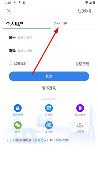 1、打开江苏交通云APP的登录界面,找到企业用户选项并点击,切换至企业用户登录页面。