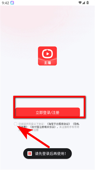 1、在淘宝主播页面,勾选协议后点击立即登录/注册按钮,进入账号页面。