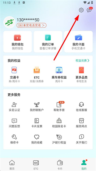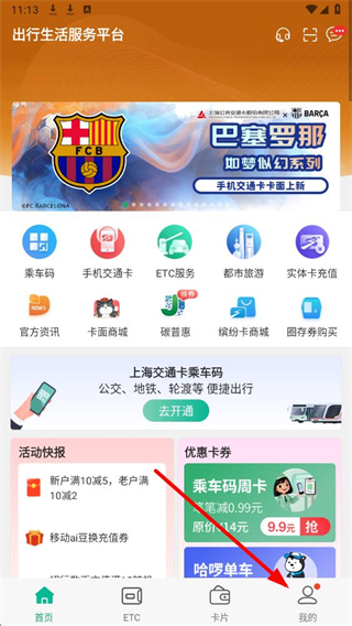 1、进入上海交通卡应用后,点击界面底部我的选项,进入个人功能页面。