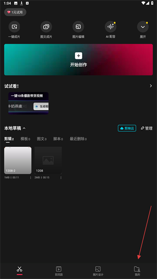 1、打开剪映的应用,进入时点击右下角我的图标。