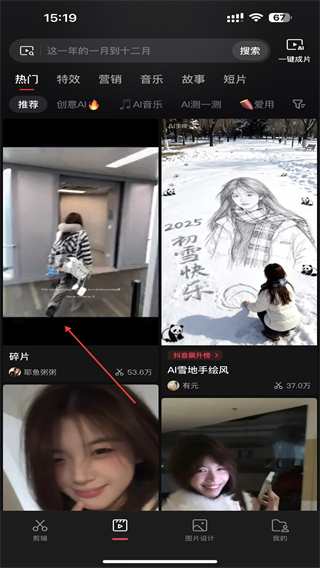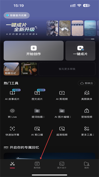 1、打开剪映App,点击底部导航栏的剪同款的选项。