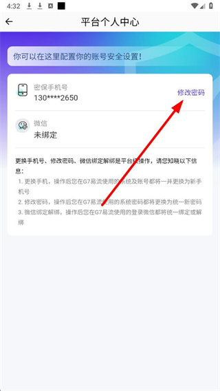3、在平台个人中心页面,点击密保手机号右侧的修改密码选项。