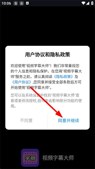 1、打开视频字幕大师,在弹窗中,点击同意并继续。