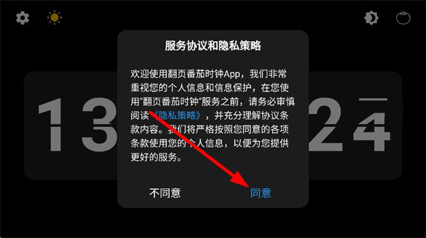 1、打开翻页番茄时钟app,在弹窗中点击同意。