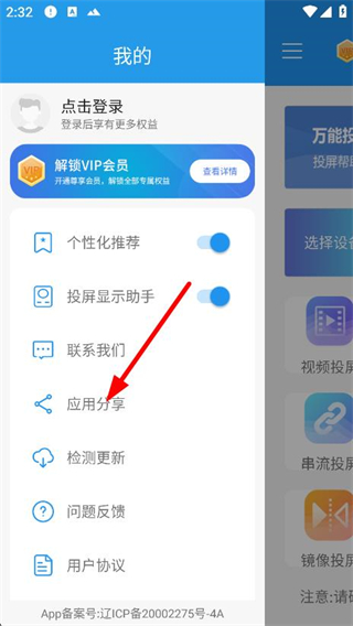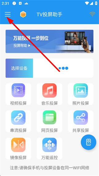 1、打开TV投屏助手app,点击页面左上角的菜单按钮。